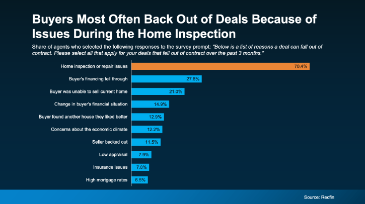 A Redfin survey shows over 70% of recently cancelled contracts happened because of issues during the home inspection (see graph below):