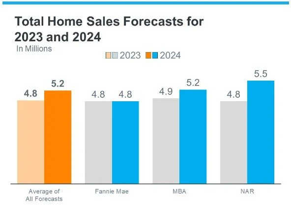 While 2023 hasn’t seen a lot of home sales relative to more normal years in the housing market, experts are forecasting a bit more activity next year. Here’s what those same three organizations project for the rest of this year, and in 2024 (see graph below):