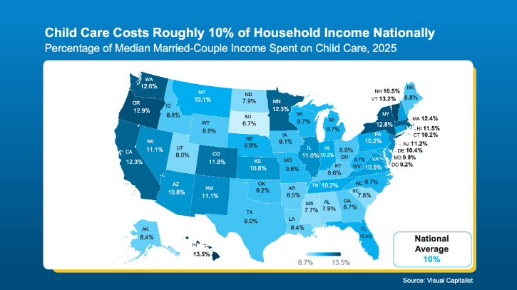 According to the Department of Health and Human Services, childcare should take up no more than 7% of your monthly income. But in reality, the average married couple spends closer to 10% (see map below):